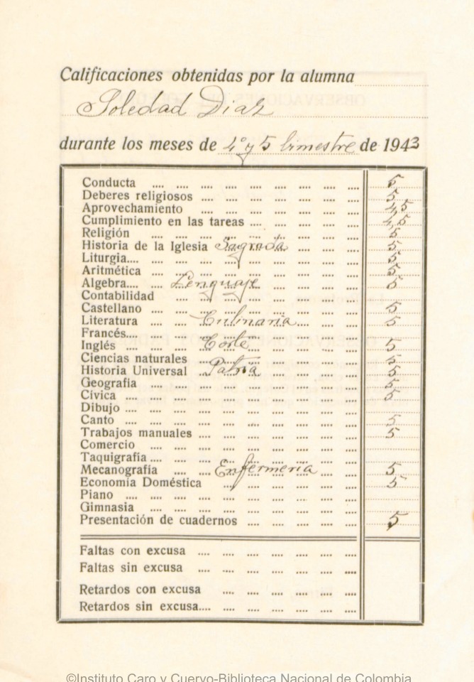 Una vez revisados los cuadernos pude dar cuenta de que Soledad los escribió entre 1941 y 1945 mientras cursaba su bachillerato junto a otras quince futuras normalistas. De todos los cuadernos con fechas, estos fueron los años de inicio y finalización de la escritura identificados. Además, pude inferir que se trataba de cuadernos de los diferentes temas que veía en sus clases y no de las materias que se enseñaban en el colegio, como se pensó en un principio.