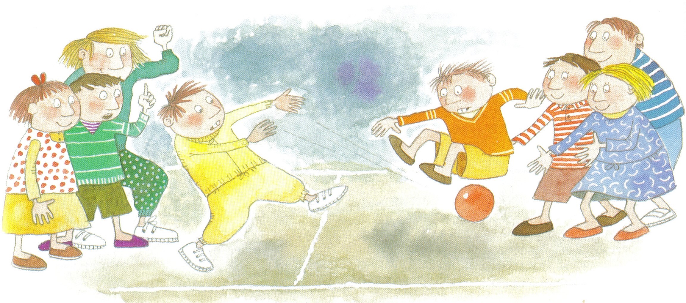 El profesor hace preguntas generales a los niños: “¿En cuál dirección deben correr para lanzar la pelota?”, “¿Cuál es la forma de la cancha?”, “¿Es un cuadrado?”, “¿Es un rectángulo?”, “¿Cómo se ubica cada equipo?”.