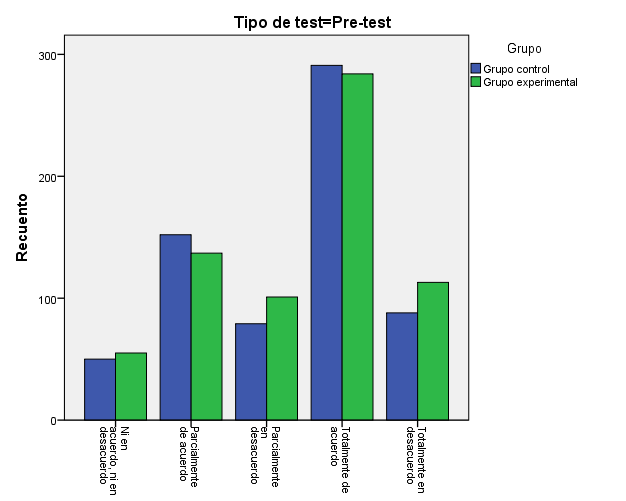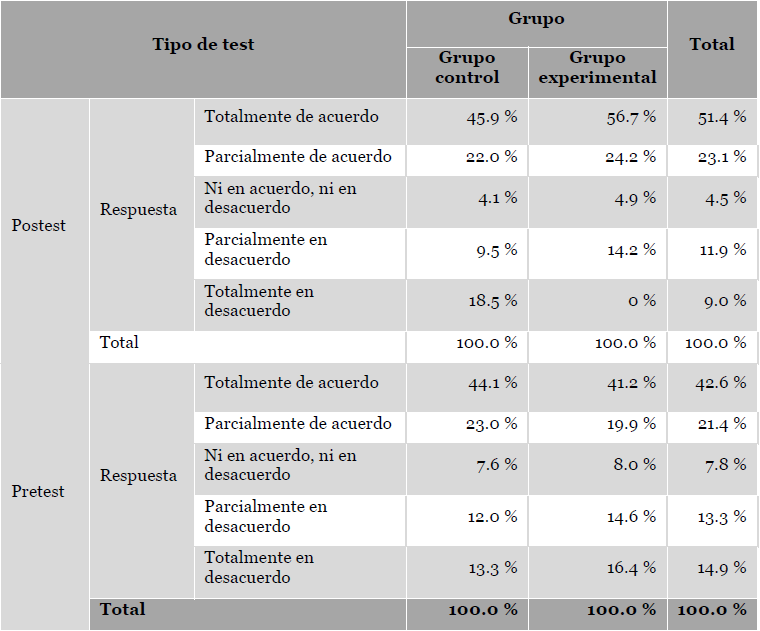 Superada la etapa de recolección de información, se exponen los resultados finales de los pretest (grupo control y experimental) y postest (grupo control y experimental), con base en la escala Liker empleada para su sistematización. Esta primera presentación hace referencia al análisis de frecuencias, definida por Hueso y Cascant (2012) como una medida que hace referencia a la cantidad de veces que una variable toma un valor determinado.