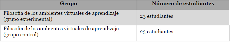 Las condiciones iniciales de los dos grupos (experimental y control) son las mismas, la muestra la constituyen dos grupos ya establecidos por la Facultad de Educación matriculados en el espacio académico Filosofía de los Ambientes Virtuales de Aprendizaje en la modalidad a distancia, ubicados en los 13 Centros de Atención Universitaria (CAU) distribuidos en los diferentes departamentos de Colombia.