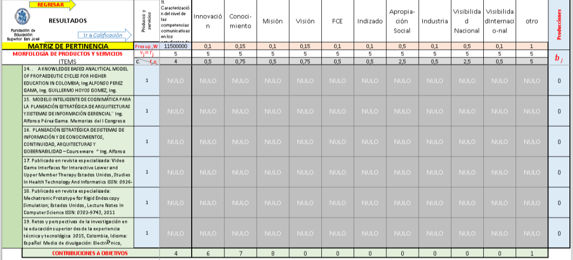 El sistema promedio da resultados en los mismos términos. Estos se despliegan en una matriz de resultados que contiene la cuantificación curricular de contribución cognitiva, matriz resultante que se observa en la figura 3.