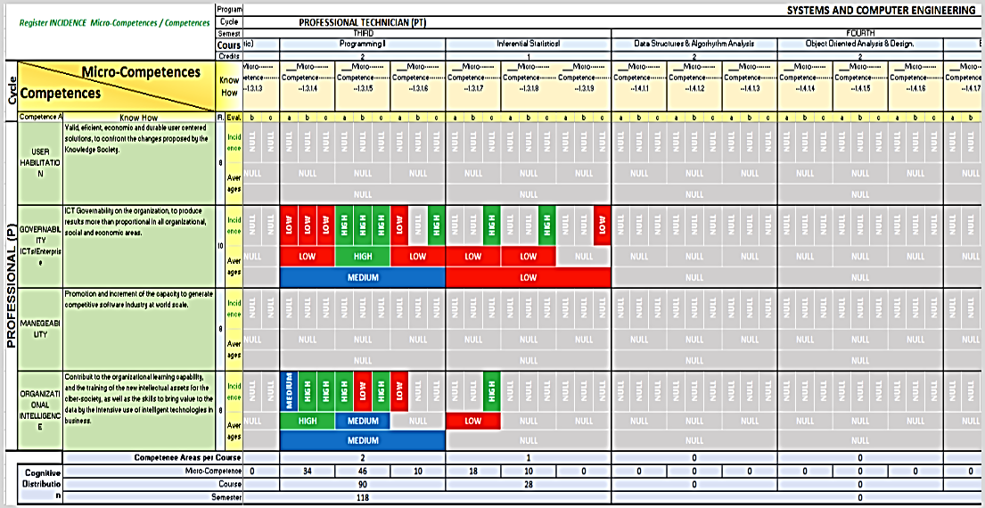 Por otra parte, cada coeficiente representa la cohesión y coherencia de cada objetivo con la producción, que pueden contener otros valores cualitativos (lógica fuzzy) más amplios, de tal forma que aumente el grado de posibilidades (ai,j = { nulo, bajo, medio, alto}; representado por colores: blanco, verde, rojo, azul). Para cada celda, varios expertos independientes deben dar su opinión de grado de incidencia, el cual representa la coherencia y cohesión de cada competencia con la microcompetencia de la asignatura.
