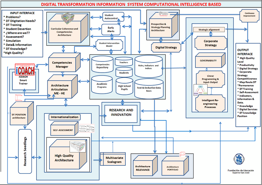 Las bases conceptuales de la inteligencia artificial, sistemas expertos, e ingeniería del conocimiento y la gestión, son punto fundamental en la transformación digital de la educación. De esto, la Lógica Difusa como sistema experto, es el pilar de nuestro modelo basado en matrices que se auto rellenan a partir de perspectivas de expertos, de directrices del Ministerio de Educación en sus matrices (sistemas cualitativos), emigrando a datos cuantitativos a partir de reglas de inferencia (sistemas cuantitativos). Este modelo digitaliza las mallas curriculares y la gestión institucional, es decir, conocimientos y datos. Esta arquitectura digital se soporta sobre los sistemas de financiación universitaria, la investigación, el espíritu empresarial, talento digital, proyección social, docencia, estudiantes, entre otros. Todos estos elementos generan las matrices objetivo que generan datos que soportan los elementos de alta calidad que exige el Ministerio de Educación.