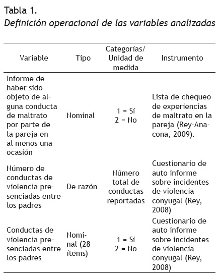 El grupo de participantes que reportó maltrato y el grupo que no informó esta situación fueron comparados en cuanto al número de participantes que presenció al menos una conducta de violencia entre los padres y en relación con cada una de las 28 conductas violentas presentes en el Cuestionario de auto informe sobre incidentes de violencia conyugal (Rey, 2008), comparaciones que también se realizaron por sexo y por etapa del ciclo vital: Adolescentes (15-20 años) y adultos jóvenes (21-30 años). Se efectuaron las mismas comparaciones entre los varones y las mujeres y entre los adolescentes y los adultos jóvenes del grupo que fue objeto de alguna forma de maltrato por parte de su pareja. Todos estos análisis se efectuaron a través de la prueba "Chi Cuadrado de Pearson", aceptándose un nivel de significancia mínimo de .05, bilateral (en la Tabla 1 se definen operacionalmente las variables analizadas).