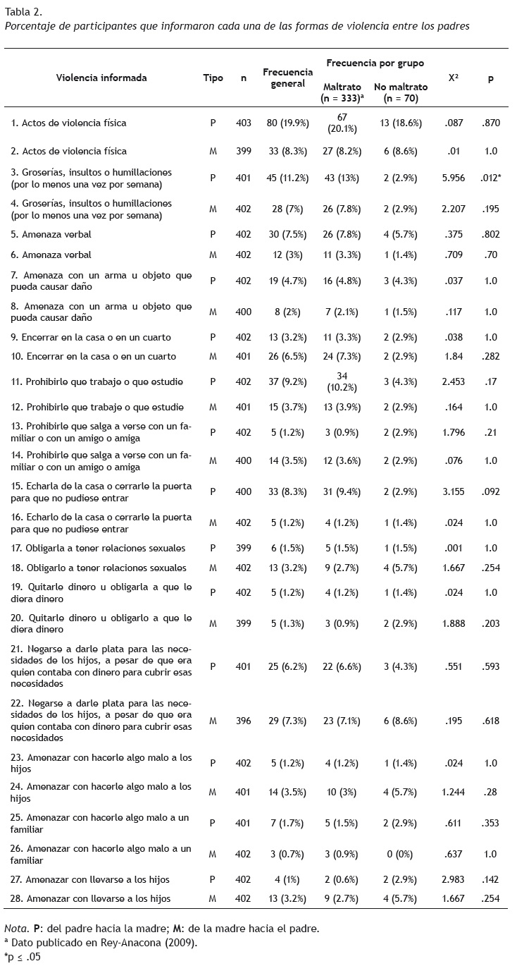 Las comparaciones efectuadas por grupo en relación con cada una de las 28 conductas violentas presenciadas entre los padres, por otra parte, evidenciaron que los participantes que fueron objeto de maltrato por parte de su pareja, informaron con una frecuencia significativamente mayor haber presenciado "groserías, insultos o humillaciones (por lo menos una vez por semana) del padre hacia la madre", que los participantes que no fueron maltratados (X2 [1, 401] = 5.956, p = .012). No se encontraron diferencias estadísticamente significativas en las demás formas de violencia (véase Tabla 2).