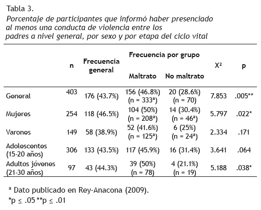 Las comparaciones efectuadas entre los adolescentes de los dos grupos de participantes, de otro lado, evidenciaron que los que fueron objeto de alguna forma de maltrato presenciaron con mayor frecuencia la siguiente conducta: "groserías, insultos o humillaciones (por lo menos una vez por semana) del padre hacia la madre" (porcentaje global: 10.5% [n = 32]; adolescentes que informaron maltrato: 12.6% [n = 32]; adolescentes que no informaron maltrato: 0% [n = 0]; X2 [1, 305] = 7.178, p = .004). No se presentaron diferencias estadísticamente significativas entre los dos grupos de adultos jóvenes, en relación con las 28 conductas violentas bajo análisis.