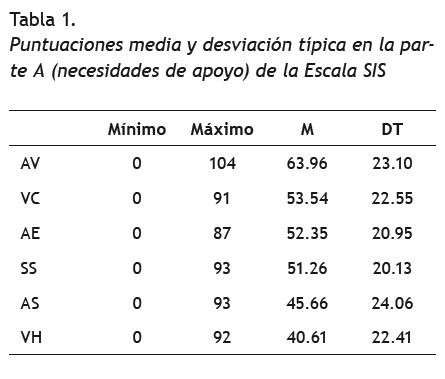 Presentamos en primer lugar los promedios, rangos y dispersión de las puntuaciones en la SIS. Esta evaluación equivale a lo que Thompson et ál., (2009) denominan "necesidades normativas". En la tabla 1 se ofrecen las puntuaciones promedio obtenidas en las diferentes actividades de la Sección A de la SIS. Se puede apreciar cómo las mayores necesidades de apoyo surgen en las Actividades de aprendizaje a lo largo de la vida. Por otro lado, las menores necesidades de apoyo se relacionan con las Actividades de vida en el hogar.
