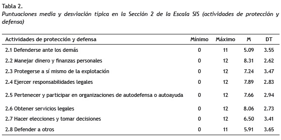 A continuación y en relación con las necesidades de apoyos detectadas a través de la Sección 2: Escala suplementaria de protección y defensa, de la SIS, los resultados se resumen en la Tabla 2. Se aprecia la existencia de mayores necesidades de apoyo relacionadas con Manejar dinero y finanzas personales y menores necesidades relacionadas con Defender a otros.