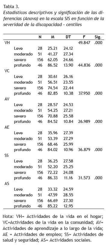 Por lo que se refiere a la esperada existencia de asociación entre severidad de la discapacidad y necesidades de apoyo, el contraste multivariado puso de manifiesto la existencia de diferencias significativas (Lambda de Wilks = 0.515, F(21, 779) = 9.649; p = 0.0001). En la Tabla 3 se observa cómo existen diferencias significativas en todas las subescalas de la SIS. Los análisis post hoc revelaron que todos los grupos difieren entre sí y que quienes presentan un grado de discapacidad profunda tienen necesidades de apoyos sustancialmente más elevadas.