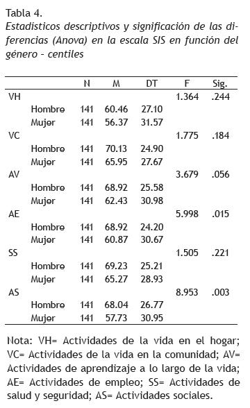 De acuerdo con nuestra tercera hipótesis, predecíamos por un lado, la ausencia de diferencias significativas entre necesidades de apoyo y edad, por tratarse todos ellos de residentes mayores de 18 años. En este caso el contraste multivariado puso de manifiesto la ausencia de diferencias significativas (Lambda de Wilks = 0.045, F(12, 544) = 0.876 p = 0.588). Sin embargo, por lo que se refiere al género, segunda parte de nuestra predicción, los análisis multivariados evidenciaron la presencia de diferencias significativas asociadas a esta variable (Lambda de Wilks = 0. 915, F(7, 274) = 3.618; p = 0.001). En la Tabla 4 se puede apreciar cómo los varones puntúan significativamente más elevado en necesidades de apoyo relacionadas con el empleo y con las actividades sociales, que sus iguales del género femenino.