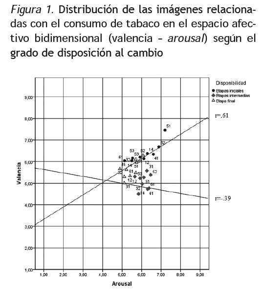 Los resultados que se exponen a continuación corresponden a la representación gráfica en el espacio afectivo bidimensional (valencia-arousal) de las imágenes asociadas con el tabaco según el grado de disposición al cambio, así como las medias, desviaciones estándar y comparaciones múltiples en valencia, arousal y dominancia de las imágenes según el grado de motivación por abandonar el consumo de tabaco.