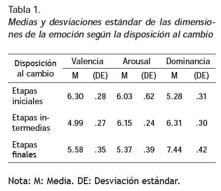 En la Tabla 1 se presentan las medias y desviaciones estándar de los puntajes obtenidos en cada una de las dimensiones de la emoción según las etapas que indican una progresión en la disposición al cambio.