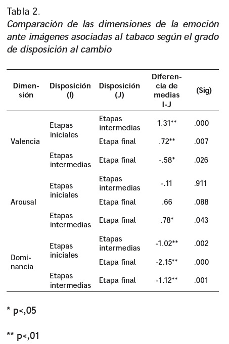 Los resultados de esta investigación muestran que las dimensiones de la emoción cambian con respecto al avance en el proceso de cambio, en este caso con relación al consumo de tabaco. Se observa que al inicio del proceso, cuando las personas tienen una baja motivación, los estímulos asociados con el consumo de tabaco activan el sistema motivacional apetitivo, lo que implica conductas de aproximación, las cuales se hacen más probables si se tiene en cuenta que en estas etapas se encontró un mayor arousal y una menor dominancia.