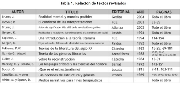 Siendo esta una investigación de tipo documental, se utilizaron varios capítulos de diferentes autores representativos, tanto para la teoría literaria estructuralista como para el enfoque construccionista social. En la tabla 1 se describen los textos por autor, año, editorial y páginas revisadas, y el orden está dado por la manera como se sistematizaron los documentos:
