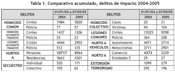 Dijin (2005) Boletín semanal de criminalidad, No. 018. Comparativo acumulado. Delitos de impacto social 2004 - 2005. http://www.policia.gov.co. Link: Estadísticas.