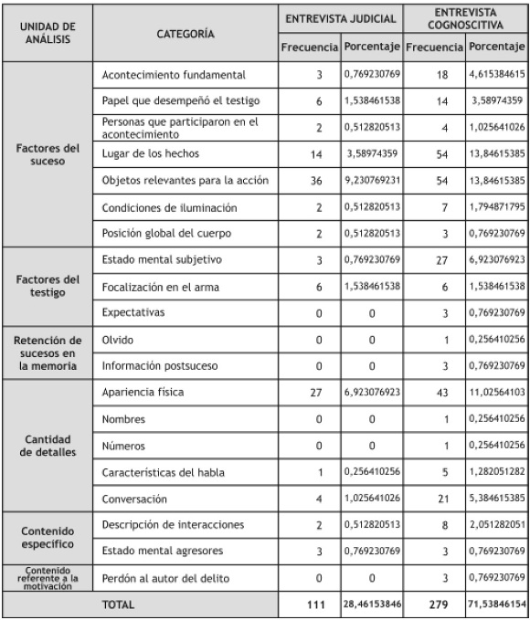 Es así como se definieron las siguientes unidades de análisis y categorías: 1. Factores del suceso: acontecimiento fundamental, papel o actividad que desempeñó el testigo, personas que participaron directamente en el acontecimiento, base temporal y espacial de los hechos, objetos relevantes para la acción, condiciones de iluminación, posición global del cuerpo. 2. Factores del testigo: estado mental subjetivo, focalización en el arma, expectativas. 3. Retención de sucesos en la memoria: olvido, información postsuceso. 4. Cantidad de detalles: apariencia física, nombres, números, características del habla, conversación. 5. Contenido específico: descripción de interacciones, estado mental de los agresores. 6. Contenidos referentes a la motivación: perdón al autor del delito.