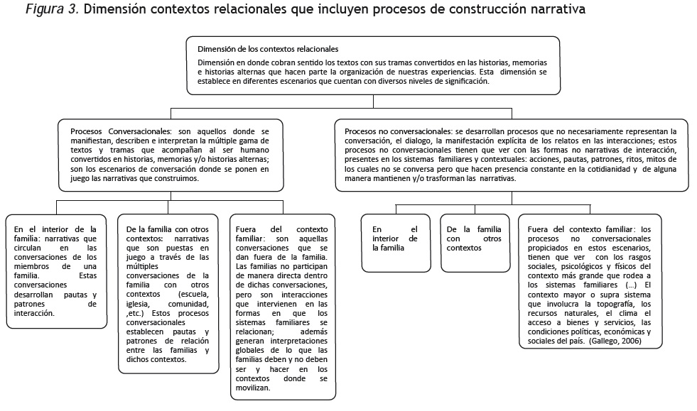 En la investigación - intervención se determinó que los escenarios conversacionales de tipo reflexivo son un ámbito en el que pueden constituirse estos relatos, ya que es aquí donde se incluyen eventos significativos que generen ruidos a los sistemas familiares y que favorezcan los quiebres (Echeverría, 1996) de aquellas narrativas dominantes que mantienen la situación de crisis. Por otra parte, Estupiñán, González y Serna (2006, pp. 65-66) definen los escenarios como: