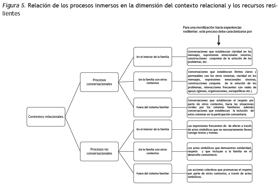 La propuesta planteada sugiere que para favorecer los relatos resilientes en los sistemas familiares, además de instaurar las pautas relacionales mencionadas, se deben incluir conversaciones que relacionen los procesos de construcción narrativa con los recursos resilientes que transitan en los diferentes contextos ecológicos.