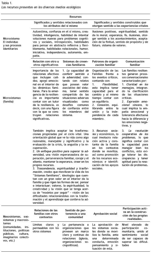Estos recursos que circulan en los diferentes medios ecológicos, que a través de múltiples conversiones se cruzan unos con otros en forma de bucle, es decir, que son productos y efectos y a la vez son productores y causadores de otros recursos (González, 1997; González y Morin, 1997), se convierten en el eje que articula las diferentes perspectivas de la resiliencia. Algunos autores lo llaman factores protectores, otros lo denominan "los pilares de la resiliencia" (Melillo y Ojeda, 2001). Para el presente artículo se comprende que estos mecanismos se hacen presentes y se movilizan en las relaciones entre los diferentes contextos ecológicos y que al entretejerse en tiempos, modos, y relaciones particulares favorecen y recrean la resiliencia; se construyen con las experiencias vitales y se transforman con el transcurrir del tiempo, hacen parte de las historias y las identidades de los sistemas y se entrelazan de manera estrecha, con la forma de significar y otorgar sentido a las diversas situaciones de la vida; son puestos en juego en circunstancias críticas y pueden resignificarse e incluso emerger de forma diferente de acuerdo con los sucesos.