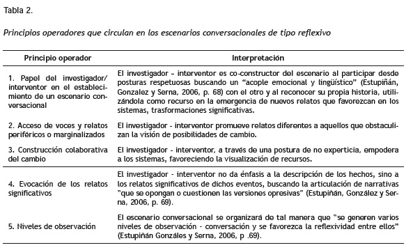 En este sentido el investigador - interventor debe instaurar algunas pautas que ayuden a establecer diálogos potenciadores de recursos. Según Estupiñán, González & Serna (2006) estas pautas, las cuáles no poseen un orden específico, se denominan "principios operadores" y permiten que el investigador - interventor asuma ciertas posturas que facilitan el cambio en los sistemas familiares; a modo de resumen, se presentan dichos principios operadores en la Tabla 2.