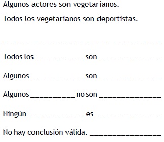 Cada ítem es un silogismo y, como tal, está formado por la premisa mayor, la premisa menor y luego una conclusión. La conclusión debe obtenerse a partir de cinco opciones. Para minimizar el efecto del azar, propio de la elección múltiple, pero al mismo tiempo evitar las respuestas inclasificables, siguiendo a Santamaría (1989), y de manera similar a Espino, Santamaría y García Madruga (2000), se optó por un formato de respuesta cerrada, a saber: todos los ... son ... , algunos ... son ... , algunos ... no son ... , ningún ... es ... , no hay conclusión válida. Los sujetos debían completar las líneas de puntos con los términos extremos de las premisas para construir la conclusión correcta, si existiere, o elegir la última opción.