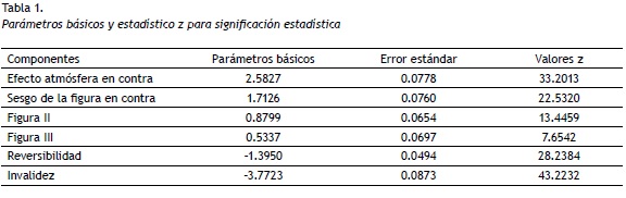 La tabla 1 muestra los parámetros básicos de cada componente, esto es, la incidencia en la dificultad y los resultados del test estadístico de ajuste. En todos los casos los componentes resultaron significativos, con valores p < 0,000001. El programa LPCM-WIN invierte el signo de los parámetros de dificultad, por lo cual más negativo significa más difícil. Para exhibir los resultados de acuerdo con la bibliografía general, se han invertido los signos de las salidas computacionales de dicho programa.
