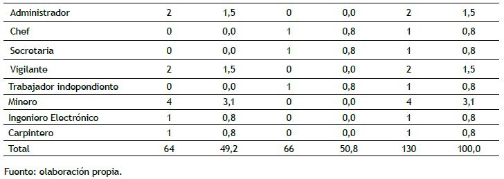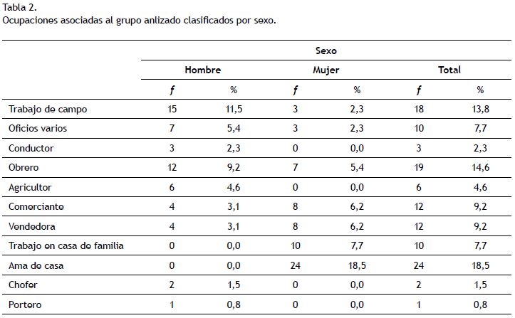Las profesiones del grupo analizado son variadas y se muestran en la tabla 2. Aproximadamente el 19 % del grupo son mujeres amas de casa; el 15 % obreros (9,2 % hombres y 6,4 % mujeres); el 13,8 % fueron trabajadores de campo; 9,2 % son vendedores y comerciantes respectivamente. El resto representa ocupaciones variadas con baja proporción (inferior al 2 %), tales como chofer, minero, vigilate, y secretarias, entre otros oficios.