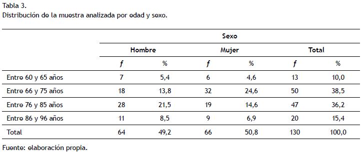 Aproximadamente el 75 % de la muestra presentó edades que oscilaron entre 66 y 85 años. El 15,4 % del grupo presentó edades superiores a 86 años.