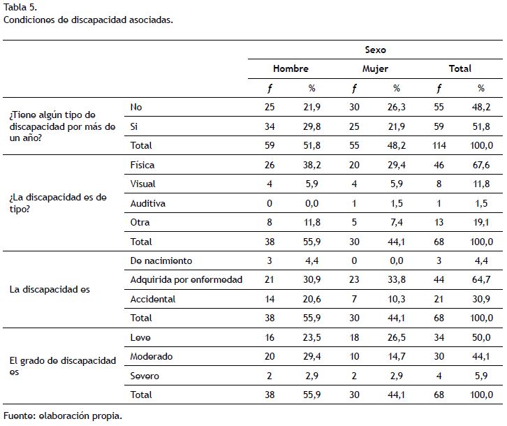 La tabla 5 muestra las características asociadas a las condiciones limitantes de los encuestados. El 51,8 % del grupo padece de algún tipo de discapacidad. Dentro de este grupo casi el 30 % son hombres. De los casos reportados con discapacidad, la gran mayoría, 67,6 %, fueron de carácter físico, el 11,8 % visual y el 20 % de los casos se corresponden con otros tipos de discapacidad. Del grupo de personas con discapacidad, aproximadamente el 65 % posee discapacidad adquirida por enfermedad o degeneración, menos del 5 % posee limitaciones desde el nacimiento y aproximadamente el 30 % adquirió la discapacidad accidentalmente. La mitad del grupo evalúa su nivel de discapacidad como leve y solo el 5,9 % como severo.