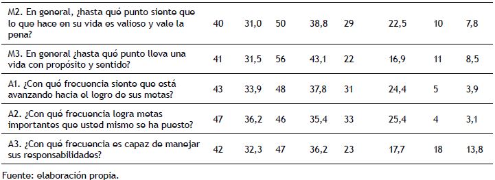 En relación con el significado de la vida, factor M, representado por los ítems m1, m2 y m3, un 37,2 % del grupo manifestó que rara vez sabe lo que quiere hacer con su vida y solo una cuarta parte de la muestra manifiesta tener claro este aspecto. Un 30 % manifiesta tener claro que lo que hace en su vida es valioso y vale la pena, mientras que un 70 % se cuestiona en este punto. Además, apenas una cuarta parte del grupo considera que su vida tiene propósito y sentido.