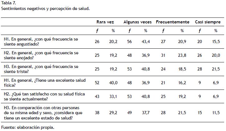 La tabla 7 refleja las dimensiones adicionales referidas a sentimientos negativos, Factor N, integrado por los ítems n1, n2 y n3 y la percepción de salud, Factor H, compuesto por los ítems h1, h2 y h3. Con referencia a los sentimientos negativos, alrededor del 20 % del grupo expresa que rara vez experimenta emociones de este tipo. Un 43 % expresó que frecuentemente se siente enojado y un 40 % manifestó que con frecuencia se siente triste. Por otra parte, un 76,9 % del grupo está consciente de su comprometido estado de salud y solo un 7 % se siente con frecuencia vigoroso.