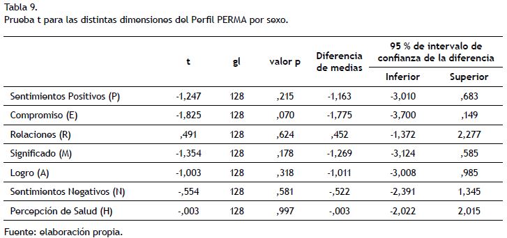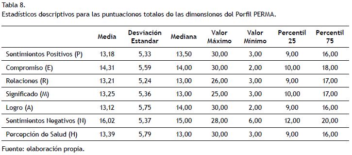 La tabla 8 muestra los estadísticos descriptivos para las puntuaciones totales de cada dimensión del perfil PERMA. Las puntuaciones medias del perfil PERMA y de la salud son homogéneas y giran alrededor de 13 puntos teniendo como máximo 30 puntos. Los sentimientos negativos es la dimensión que alcanza una mayor media que supera los 16 puntos. El 50 % de los entrevistados tiene niveles de compromiso que oscilan entre 10 y 18 puntos y de logro que varían entre 9 y 16 puntos. En conjunto los datos presentan una alta variabilidad caracterizada por una desviación típica que oscila entre 5,3 y 5,7 puntos.