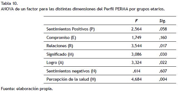 Aunque el sexo no resultó ser un factor significativo, la edad, estratificada por grupos etarios, sí lo fue. Los resultados del ANOVA de un factor se ilustran en la tabla 10. Valores de p < 0,05 se hacen evidentes para los factores P, R, M y A del modelo y el factor de percepción de salud (H). Esto indica que el reporte de los valores medios para cada una de estas dimensiones presenta diferencias significativas según la edad del adulto mayor. Pruebas pos hoc basadas en el estadístico de Duncan, permiten evidenciar que los rangos etarios que marcan la diferencia son los más altos, es decir, entre 60 y 85 años experimentan puntajes más altos en comparación con los adultos mayores de 85 años.