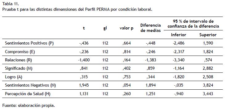 La condición laboral ha sido el otro factor considerado. La tabla 11 muestra los resultados de la prueba t para los grupos de este factor. Los resultados evidencian que existen diferencias significativas para las dimensiones P, E, M, A y H, considerando como factor la condición laboral. En efecto, los p-valores asociados p < 0,05 y el intervalo de confianza del 95 % incluye el valor de 0 para todas las dimensiones restantes. Para las dimensiones R y H no se evidenciaron diferencias significativas.