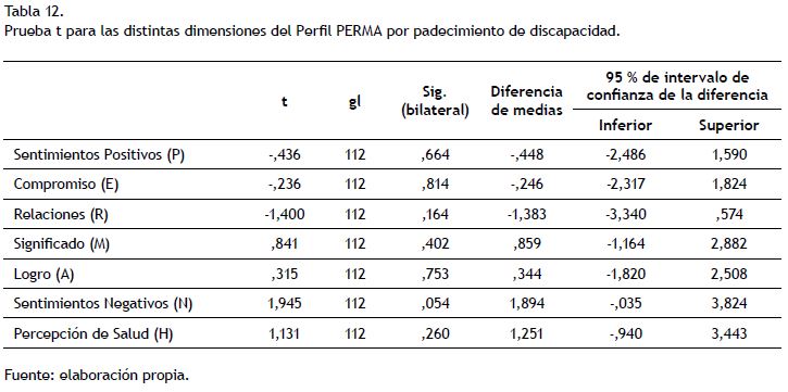 El padecimiento de una condición de discapacidad ha sido otro de los factores considerados. La tabla 12 muestra los resultados de la prueba t para los grupos en relación con este factor. Los datos señalan que no existen diferencias significativas para todas las dimensiones, pues los p-valores asociados p > 0,05 y el intervalo de confianza del 95 % no incluye el valor de 0 para todas las dimensiones consideradas.