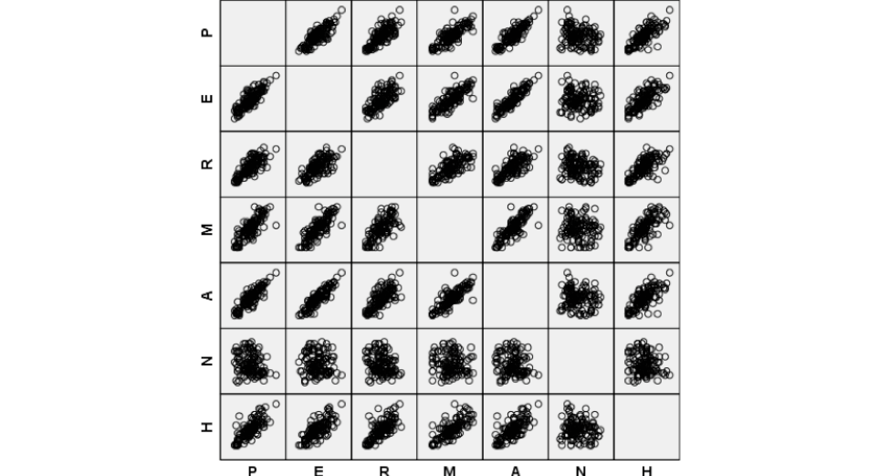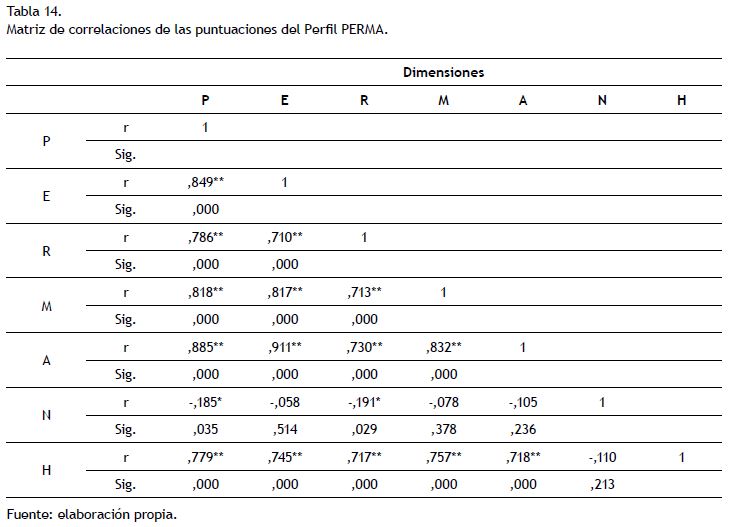 La tabla 14 muestra la matriz de correlaciones de las distintas puntuaciones que refleja el modelo PERMA. Se observan correlaciones altas y significativas entre los pares de dimensiones que abarcan el modelo, esto es: P, E, R, M A, y todas ellas en conjunto con la dimensión de percepción de salud (H). Las correlaciones bajas y no significativas son las que relacionan la dimensión de sentimientos negativos (N) con los demás factores.