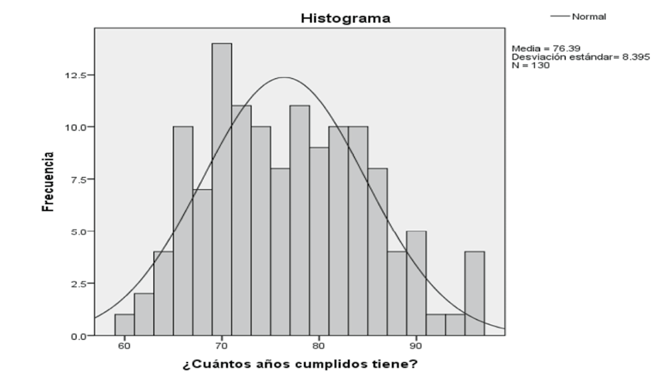La edad promedio del grupo fue de 76,25 años, con una desviación típica de 8,65 años. El 50 % de los adultos analizados tenían 76 años o menos. El conjunto de edades presenta una variabilidad alta, que oscila entre los 56 y 96 años. El 50 % del grupo presentó entre 70 y 83 años. La distribución de los datos presenta normalidad, pues los coeficientes de asimetría (0,165 / 0,212 = 0,77) y curtosis (-0.380 / 0,422 = -0,90), se encuentran dentro del rango de ± 1,96. La representación gráfica de estos datos se observa en la figura 1.