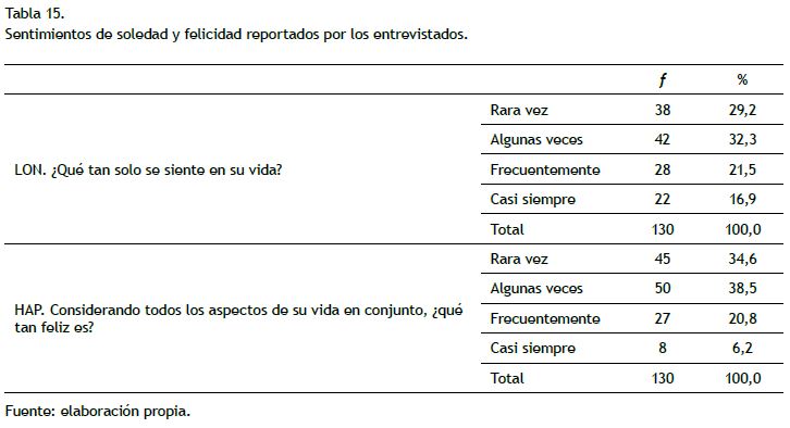 La tabla 15 muestra un par de indicadores importantes para interpretar el bienestar integral a través del perfil PERMA. Tales indicadores son los sentimientos de soledad (LON) y felicidad (HAP). Cerca del 30 % del grupo rara vez se siente solo y un porcentaje ligeramente superior (35 %) rara vez experimenta sensaciones de felicidad. Los sentimientos de soledad son más frecuentes que los de felicidad (38 % vs 26 %)