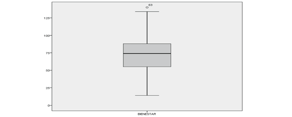 El diagrama de caja mostrada en la figura 4 refleja que los datos tienen una mediana en el valor de 74 puntos y que solo existe un valor extremo que reporta un bienestar de 140 puntos. Estos valores reportan un nivel medio de bienestar autopercibido por los adultos institucionalizados.
