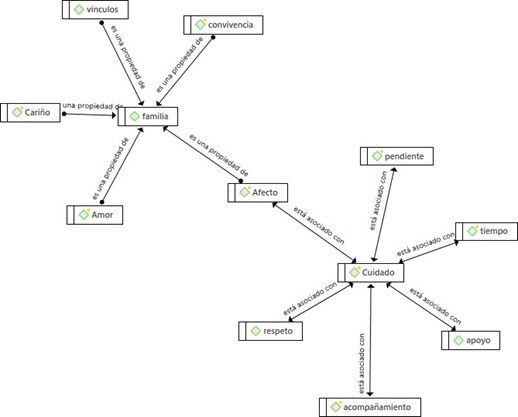 Ahora bien, las familias participantes relacionan el cuidado en diferentes expresiones. El primero, como lo muestra la Figura 1, es un elemento en común entre la comprensión de familia y la comprensión de cuidado, el afecto. Frente a esto, dicen que el cuidado se brinda a personas por quienes se siente un nivel de aprecio, lo que permite que tengan cierto interés en ayudar y poner atención hacia esta persona. Dicho de otra manera, el cuidado es brindado a alguien por quien siento afecto y tengo afinidad.